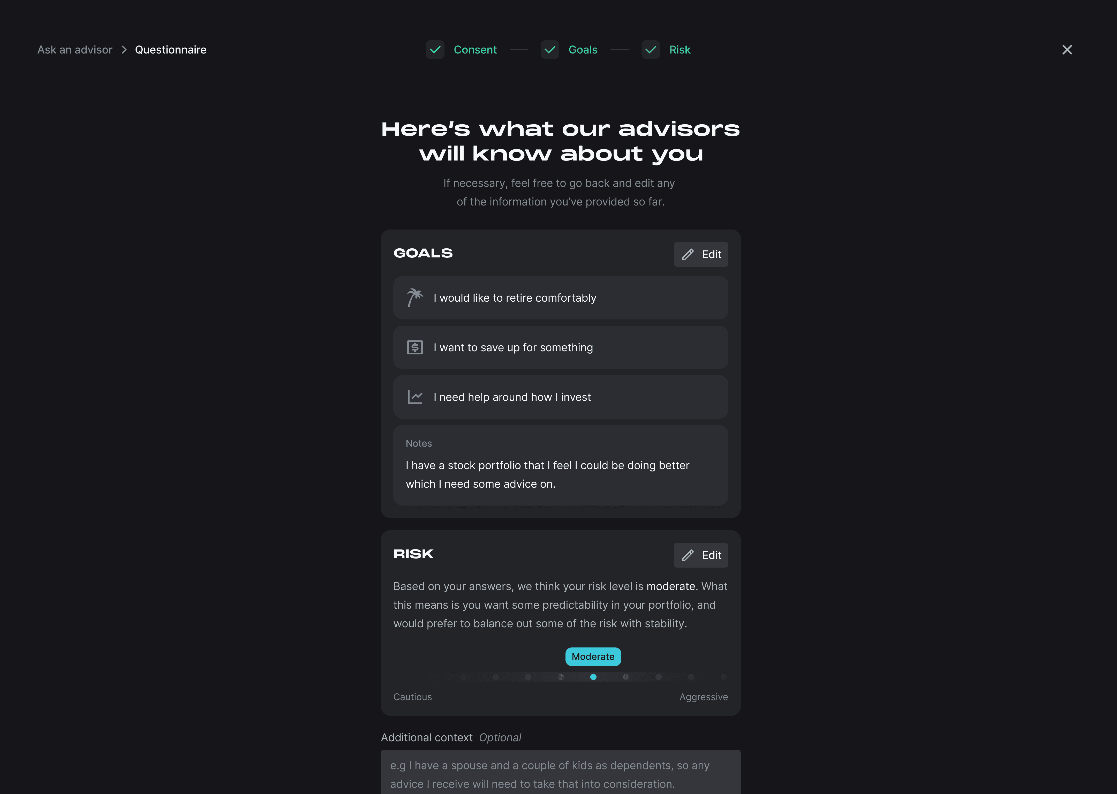 I was responsible for designing the end-to-end ATA (ask the advisor) experience which involved collaborating with our in-house advisor and co-founder, Travis, to understand what sort of questions clients were asking.